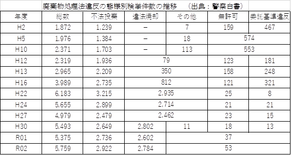 そうした中で、全国で発生している法律違反の状況がどうなっているかは関心があるものと推測します。今回は、警察庁が公表している「警察白書」から集計した結果を基に、廃棄物処理法違反検挙状況について情報提供させていただきます。