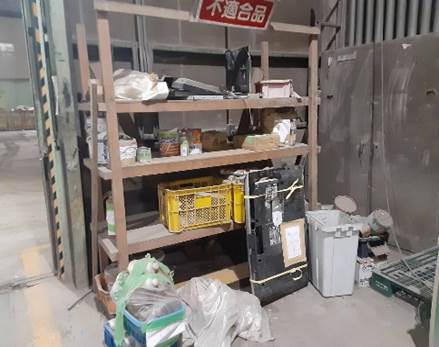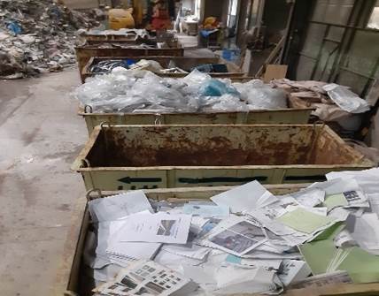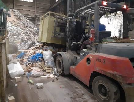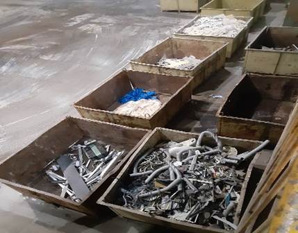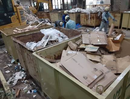 弊社に搬入された廃棄物は、BOXはフォークリフトで※@、2t車・4t車などはダンプアップにて前選別場所に空けます。前回でもご案内させて頂いた通り、重機と人の手によって※A廃棄物の中のある程度の大きさの物からリサイクルできる物(木屑、RPF材など)、埋立処分する物、有価物(非鉄、金属類)と大まかに3種類に分別します。3種類の中でもまた更に品目毎(出荷処分先)に分別する為実際には10数種類※BCDに分けられています。この段階においての選別精度がリサイクル率に繋がる為、弊社では新入社員に対しての勉強会、各工場での従業員全員に対しての勉強会も行い、一人一人の意識向上もしております。なお、前選別作業中に弊社では、受入れ・処理不可となる不適合品のチェックも行っております。※E