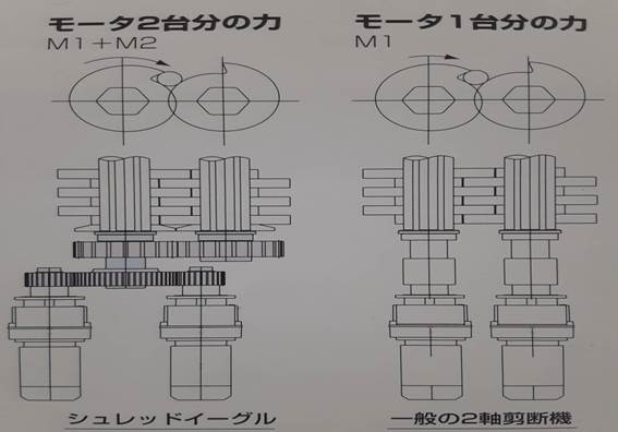 この設備は、「合成トルクドライブ方式」…2台のギヤードモータの出力をブルドライブギヤにて連結し破砕軸を駆動する方式で、一般の2軸破砕機と比べ低馬力で高トルクに破砕でき高い処理能力を維持します※@。適応処理物としましては、木屑、廃プラスチック類(樹脂類・フィルム類・ゴム類)、紙廃品、金具類(アルミ・スチール等の切削屑)、その他(ガラス・石膏など…)になりますが物によっては向き不向きがあります。