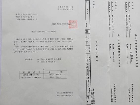 令和4年度の再生砕石(再生基礎裏込材・再生盛土材)の材料承認願がご用意できます。