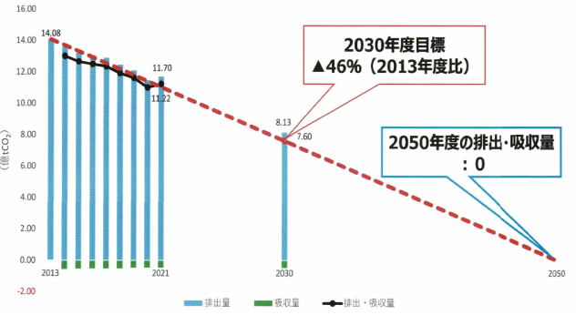2030年度目標及び2050年カーボンニュートラルに対する進捗(出典:環境省)