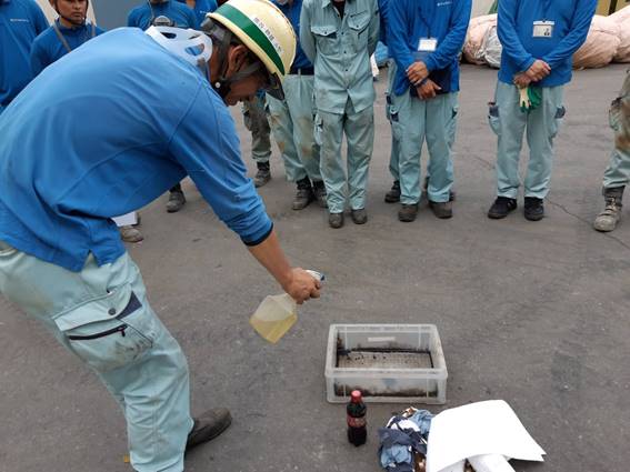 ※油圧ホースの破裂。作動油の漏洩を想定した訓練。